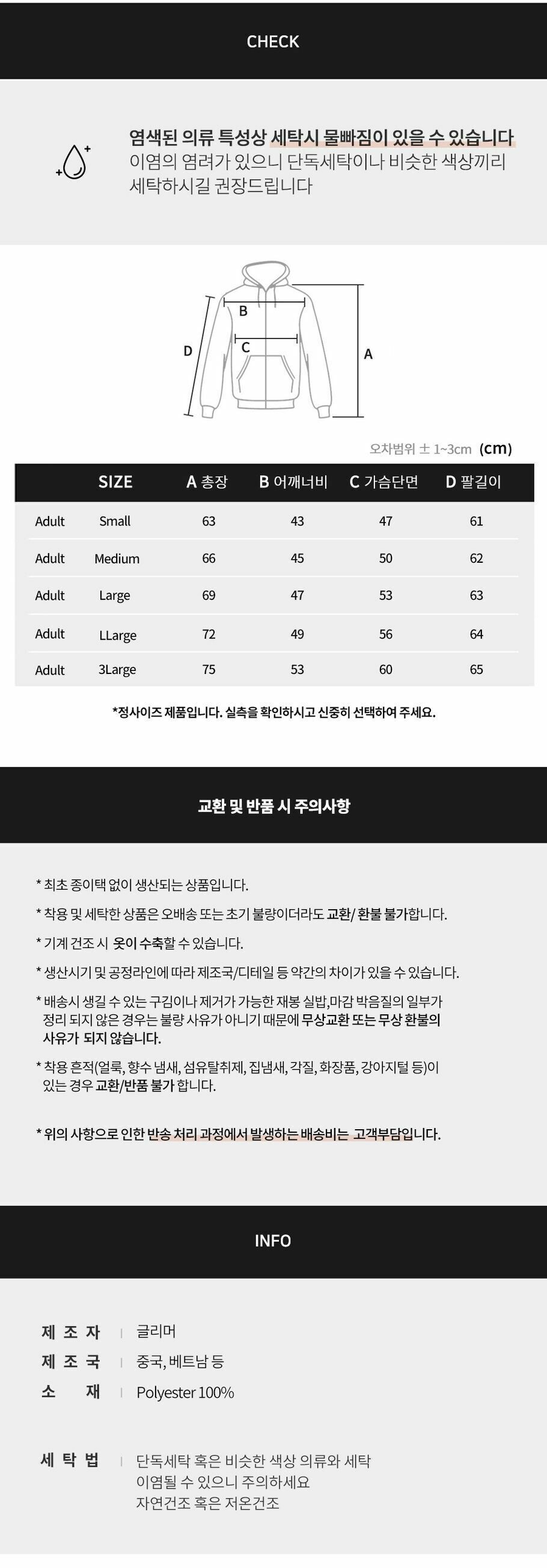 ㆍ상품 수령 후 7일이 경과, 세탁, 수선, 태그제거, 착복으로 인한 오염 등 새상품으로서의 가치가 상실된 경우 교환/반품이 불가합니다. ㆍ본사는 CJ대한통운 (편의점제외) 택배와 계약되어 있으므로 교환 운송장 번호로 쉽게 접수 가능하며, 편도 기준 2500원 외 추가운임이 발생하지 않습니다. (제주, 도서산간 제외)