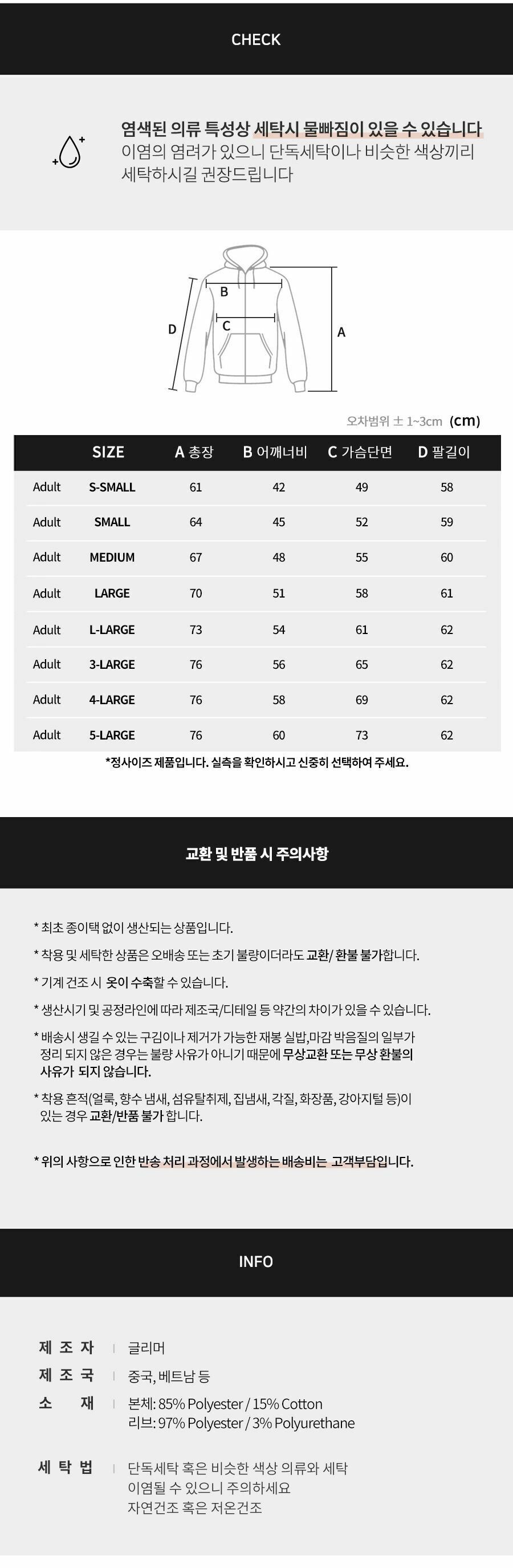 ㆍ상품 수령 후 7일이 경과, 세탁, 수선, 태그제거, 착복으로 인한 오염 등 새상품으로서의 가치가 상실된 경우 교환/반품이 불가합니다. ㆍ본사는 CJ대한통운 (편의점제외) 택배와 계약되어 있으므로 교환 운송장 번호로 쉽게 접수 가능하며, 편도 기준 2500원 외 추가운임이 발생하지 않습니다. (제주, 도서산간 제외)