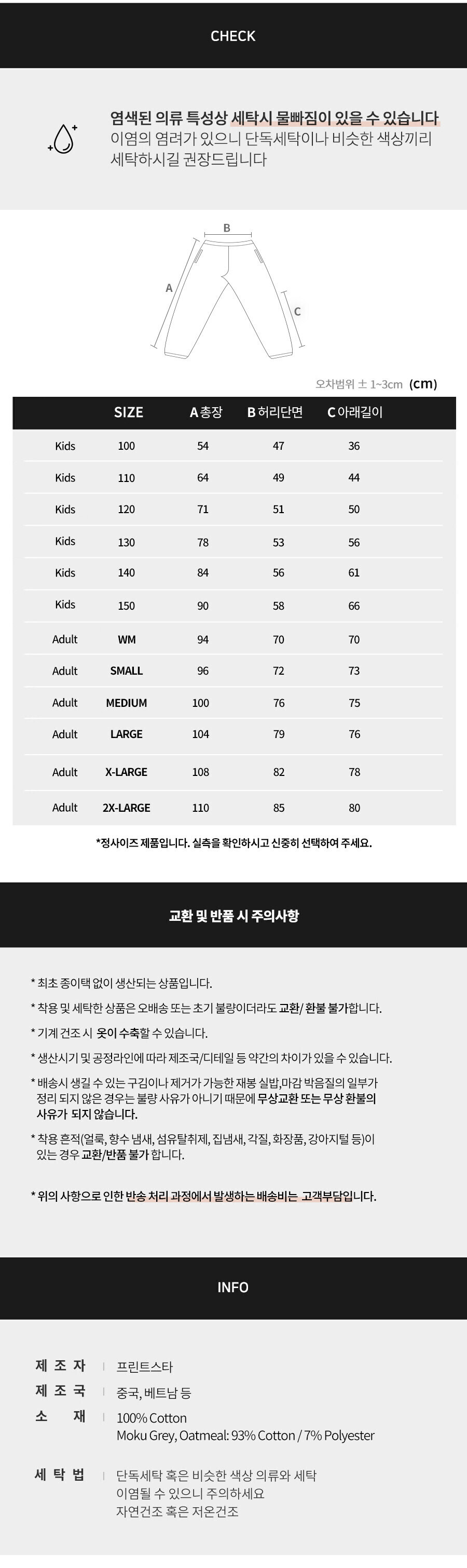 ㆍ상품 수령 후 7일이 경과, 세탁, 수선, 태그제거, 착복으로 인한 오염 등 새상품으로서의 가치가 상실된 경우 교환/반품이 불가합니다. ㆍ본사는 CJ대한통운 (편의점제외) 택배와 계약되어 있으므로 교환 운송장 번호로 쉽게 접수 가능하며, 편도 기준 2500원 외 추가운임이 발생하지 않습니다. (제주, 도서산간 제외)